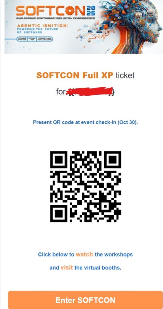 In Airmeet, SOFTCON’s virtual event platform. Click on the “Enter SOFTCON” button or the unique link at the bottom of your email (the same email with the QR code).